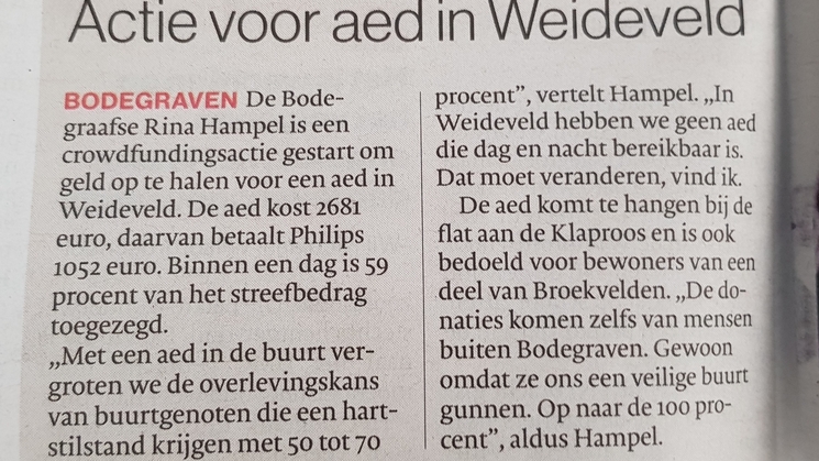 Van het platform buurtAED.nl kreeg ik een automatisch gegenereerd bericht dat de eindstreep in zicht is, en zo ervaar ik het ook. Maar we zijn er nog niet. Veel mensen weten nu van deze actie. Zaterdag stond er een bericht in het AD en er staat vandaag ook een bericht in de 'Kijk op Bodegraven-Reeuwijk'. Maar herhaling werkt, zouden jullie deze actie daarom (nog maals) kunnen delen op jullie social media kanalen. Zodra er namelijk berichten verschijnen merk ik dat ook aan de donaties die binnenkomen. Mensen krijgen weer een reminder, was het er nog niet van gekomen om te doneren, dan doen mensen dat alsnog.