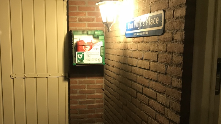 De AED hangt naast onze garagedeur (onder de buitenlamp).