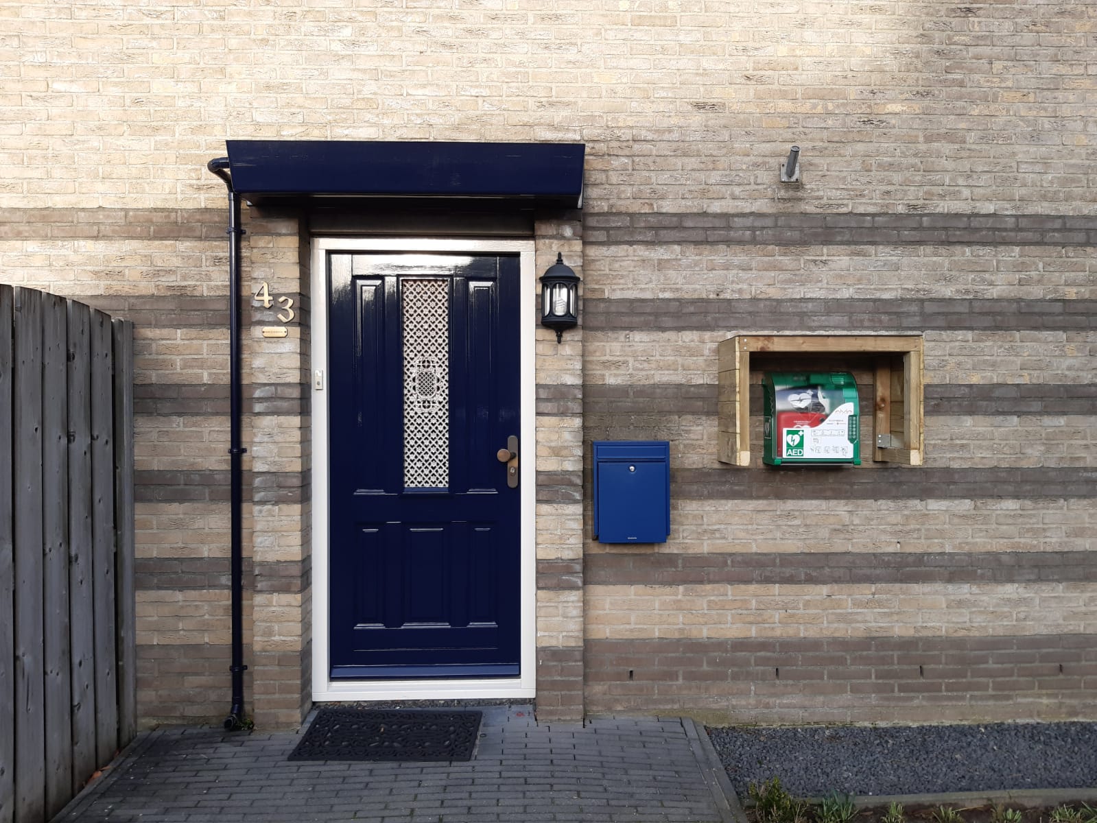 Zoals op de foto te zien hangt de AED-kast onder een afdakje. Bert van Beek, van VBE Industrial Electronics, heeft ons gratis geholpen met het aansluiten van de AED-kast op het stroomnet. De AED (met hulptas) is in de met pincode beveiligde AED-kast geplaatst. De Buurt-AED is aangemeld bij de hartstichting. Van Hartslagnu hebben wij intussen de terugkoppeling ook ontvangen.