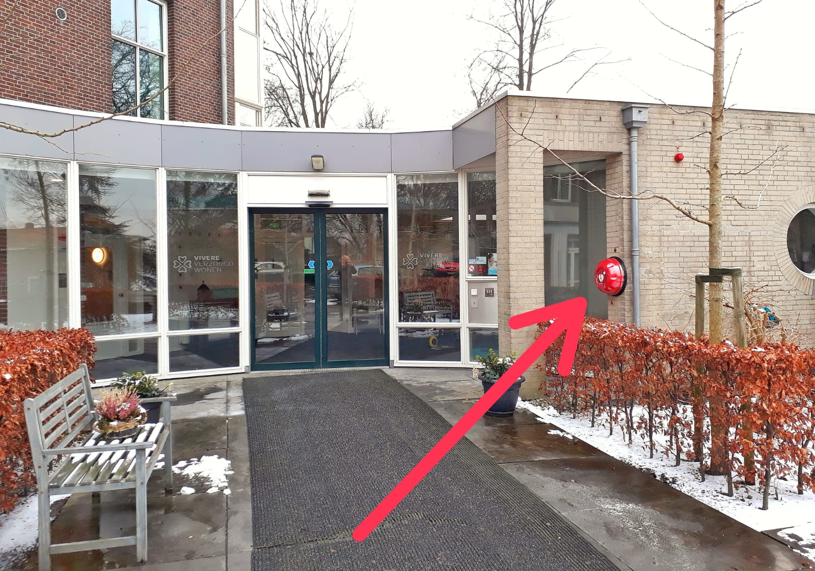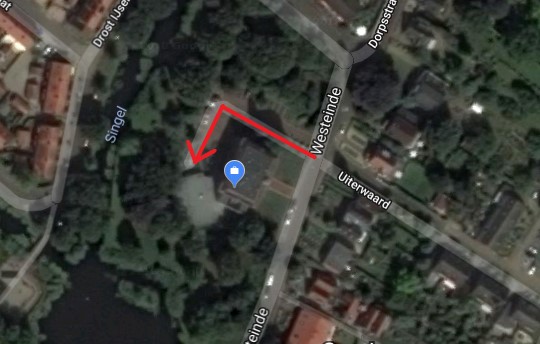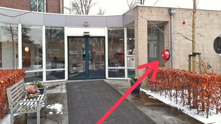 De AED hangt rechts bij de hoofdingang van Westeinde 1. Hiervoor moet u rechts van het gebouw het parkeerterrein oplopen, en dan de bocht om. Bij de 'oude' hoofdingang aan de dijk staat duidelijk aangegeven waar u naartoe moet lopen om de AED te bereiken.