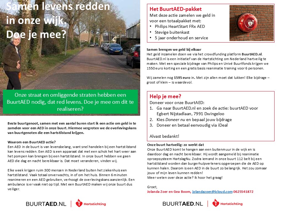 vandaag 18 maart hebben Gea en ik 150 flyers in onze buurt rond gebracht. Nog 19 dagen en dan weten we of we onze AED kunnen ophangen. De bedoeling is om deze te hangen op de hoekwoning Egbert Nijstadlaan 2, hier hangt de AED mooi in het zicht en kan iedereen er direct bij. Wij hopen dat het lukt.
