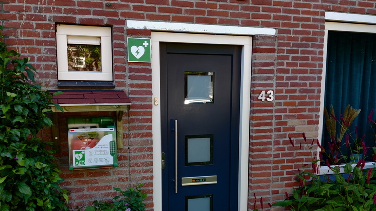 De AED zit in een buitenkast met pincode. De kast is daarbij voorzien van inbraakpreventies.