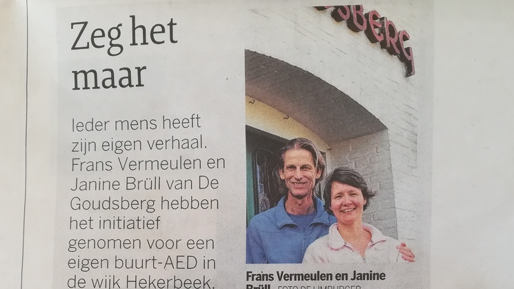 Het kranteartikel nodigt mensen ook uit om deel te nemen aan de gratis Cursus AED bedienen / reanimeren. De cursus is al snel, namelijk a.s. dinsdag 16 april van 19.00-22.00 uur in de Goudsberg.