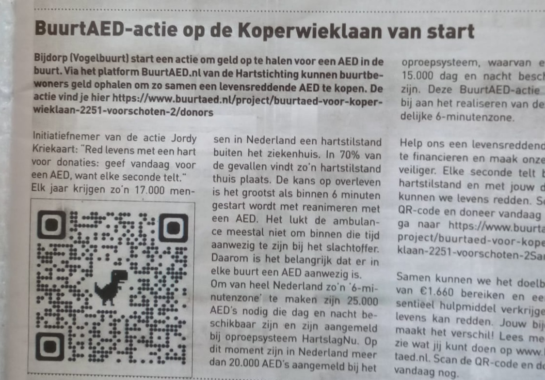 Er staat ook een stukje in de krant van Groot Voorschoten. Daarin staat de QR-code die linkt naar de actiepagina zodat mensen kunnen doneren.