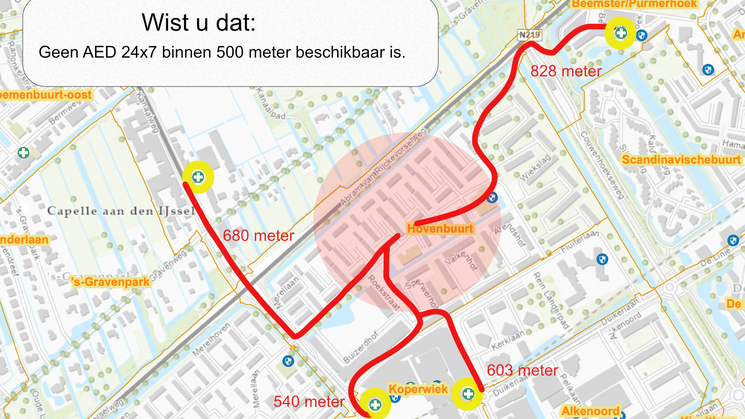 Op de afbeelding is te zien waar volgens de gemeente AED in de buurt bevinden die 24x7 vrij toegankelijk zijn. Deze zijn allemaal meer dan 500 meter verwijderd.