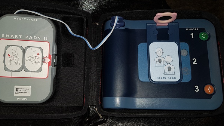 Bij de AED hangt ook een tas met daarin een beademingskapje, kledingschaar, handdoek en scheermes.