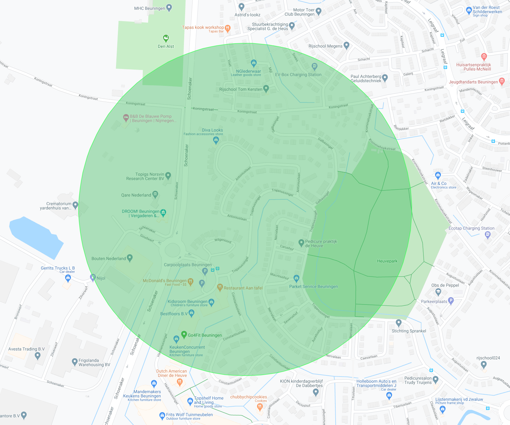 Cirkel met afstand van 400 meter ~ 5 minuten looptijd van de geplande locatie van de AED