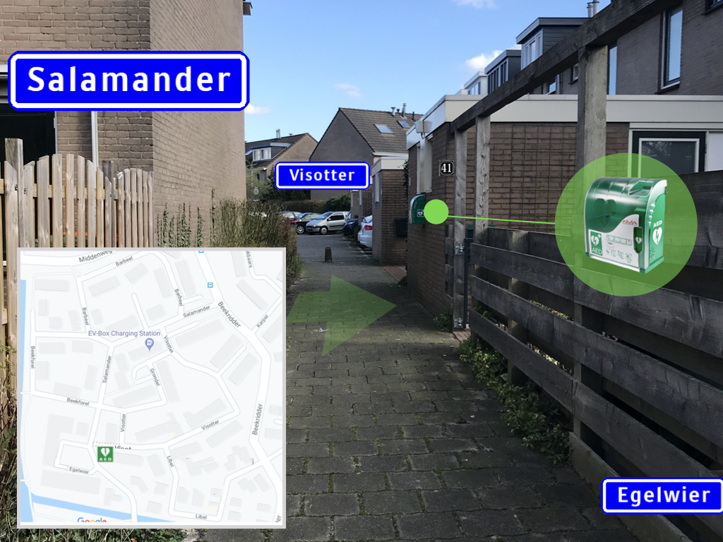 De exacte locatie van de AED is in de doorloop van de Visotter naar de Salamander. Daar hangt de AED aan de achterzijde van de woning "Visotter 41" zie ook onderstaande plaatje. Loop er bij gelegenheid eens langs en neem de juiste locatie in je op voor het onverhoopte geval je ooit de AED nodig mocht hebben.