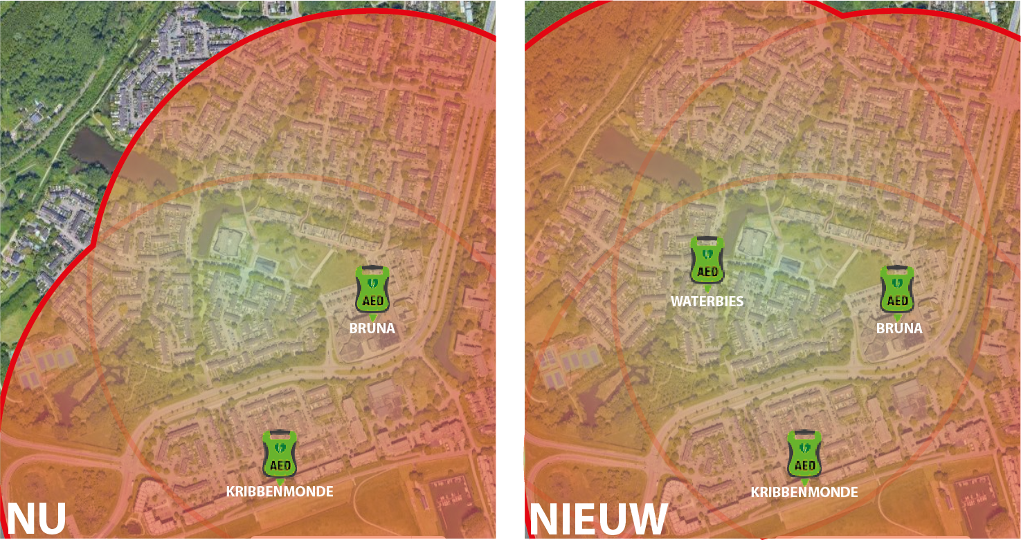 Hieronder een kaart met de huidige dekking en daarnaast een kaart met de nieuwe dekking mocht de AED aan de waterbies geplaatst worden.