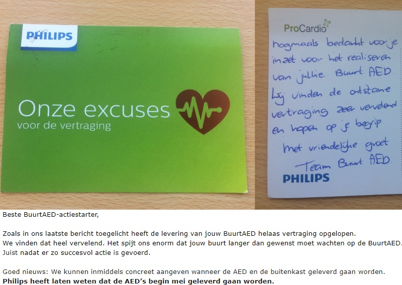 Deze week heb ik te horen gekregen dat de levering helaas is vertraagd. Begin mij wordt de AED geleverd. Ik heb een kaartje ontvangen van de partij die de AED levert en ook nog eens een email. Heb er een foto van gemaakt. Het is jammer dat het wat langer duurt maar hij gaat er komen! Ik hou jullie op de hoogte.